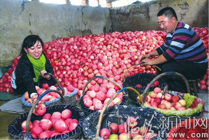 圖為東城鄉(xiāng)村民馮曉林(右)正在分類收獲的蘋果。