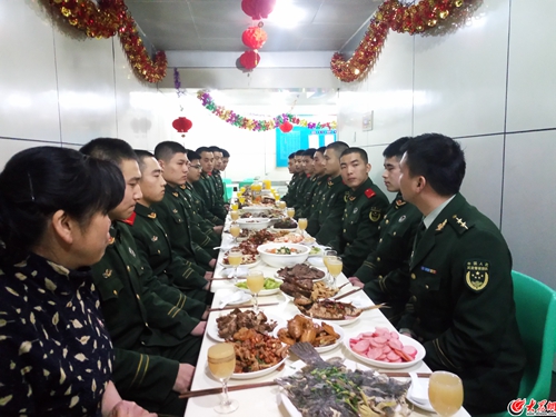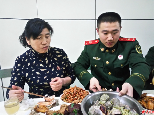 “泰山衛士”的年夜飯很豐盛,20道菜,每道菜兩份,滿滿的擺了一長桌。為了給兒子一個驚喜,袁彩文提前上山,在部隊的廚房里做了兩個紀群偉愛吃的菜——清燉多寶魚和醬雞翅。袁彩文告訴記者:“這兩道菜都是我們老家的做法,孩子不能回家過年,但是有親人的地方就是家,我得讓孩子吃口家鄉菜。部隊的孩子也都是我的孩子,我也希望為其他戰士的母親盡一盡心。”