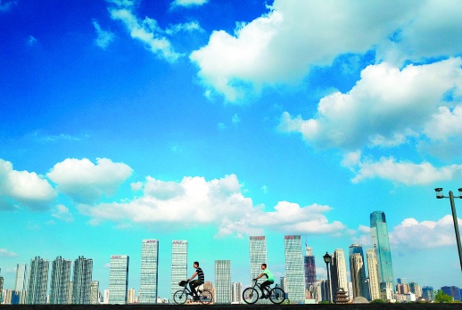 市民在長沙湘江西岸騎行,藍天、白云、城市與人構(gòu)成一幅美麗的畫卷。(資料照片)湖南日報記者 郭立亮 攝