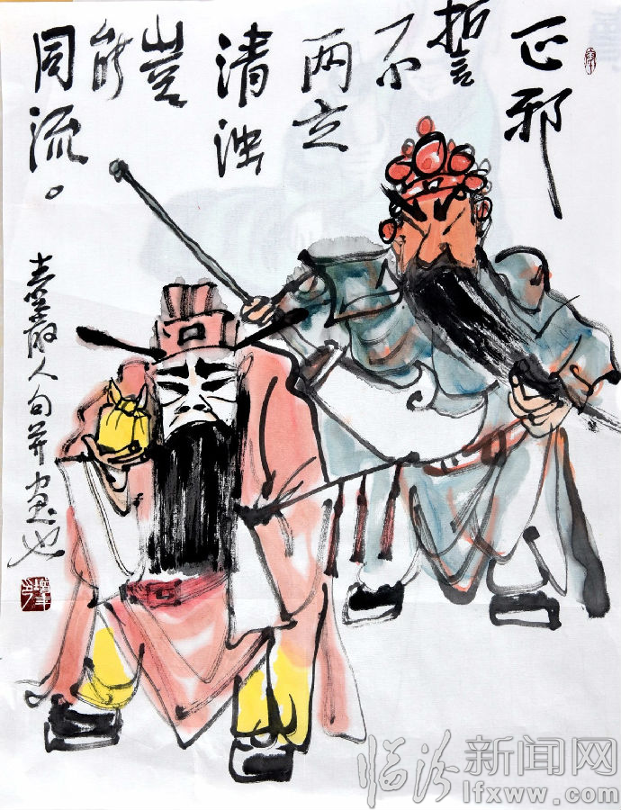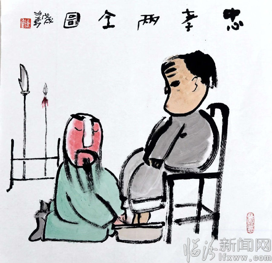 本次大賽評委、中國新聞漫畫研究會會長張耀寧說,這次比賽作品評選,圍繞“水墨、漫畫”四個字展開,就是要用水墨的筆法表達漫畫的意圖。首先是看水墨的技法。其次,是看用水墨的技法所表達的內容。漫畫是畫思想的藝術。要用詼諧幽默的畫面,表達對某個問題、某種現象的看法。造型要變形、夸張。漫畫一定要表達一種思想,或者諷刺、或者歌頌、或者哲理。這是我們評選的標準。一等獎《忠孝兩全圖》,首先,筆墨很老到。其次,關公是忠義的代表,關公給母親洗腳,不管是《三國志》還是《三國演義》都沒有這樣的記載,生活中沒有,但它一定是合理的。漫畫經常是用現實中沒有、但邏輯上推理是可以有的、合情合理的表達手法來進行創作,這就是這幅作品的藝術性和思想性所在。