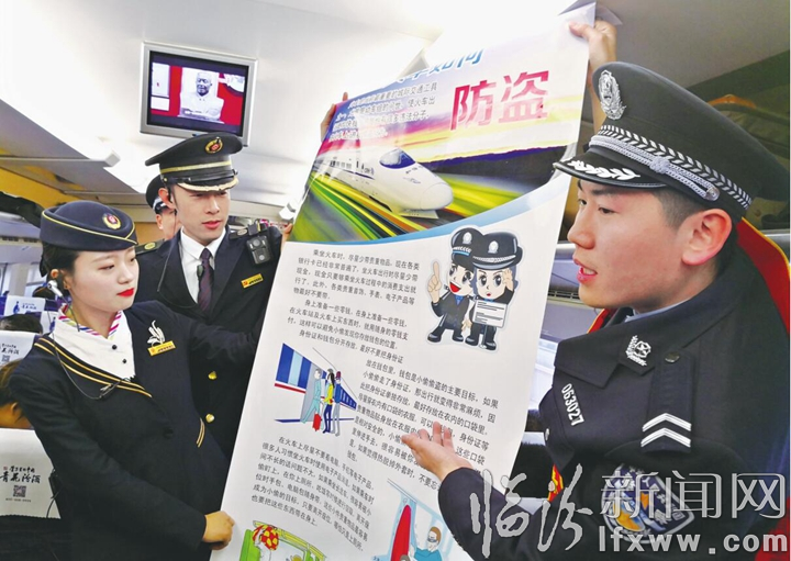 臨汾新聞網訊 春運期間,臨汾鐵路公安處將組織志愿者小分隊走進車站候車廳、高鐵列車等處,助力平安春運。圖為2月1日,在動車組D2507臨汾西開往西安北的列車上,臨汾鐵路公安處的民警在為旅客講解春運防盜知識。
