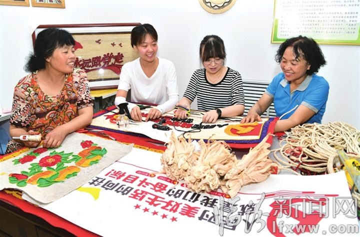圖① 市委老干部局學藝共享平臺草編培訓班的師生在創作慶祝建黨98周年的草編工藝品。