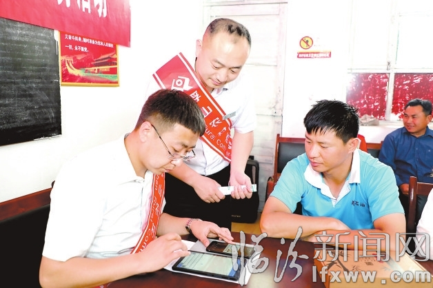 圖為浮山農(nóng)商銀行工作人員利用村委會(huì)會(huì)議室現(xiàn)場(chǎng)為村民進(jìn)行“線上放貸”。