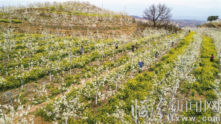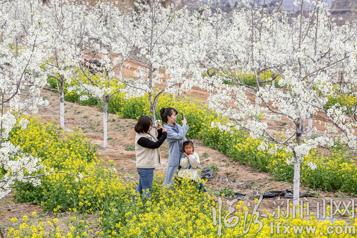 置身梨園,就像走進了花的海洋。山間是一樹樹競相綻放的梨花,白得耀眼,美得迷人。樹下是一片片競相怒放的油菜花,開得燦爛,香得醉人。白、黃之間除了洪洞、霍州、靈石、堯都等地的游客,就是當地勞作的村民,他們用辛勤的雙手播種希望。