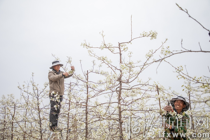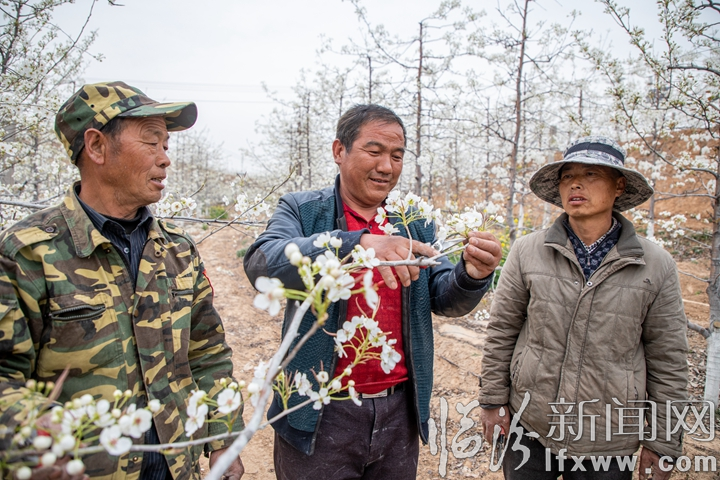 在梨園里,“土專家”楊潤林正在指導貧困戶焦云生等人進行疏花。目前正在作業的共有10個生產隊、21個作業小組近200人。他們都是梨園周邊團柏鄉、永安鎮、僧念鎮、和平鎮等地的村民,其中還有不少建檔立卡貧困戶。