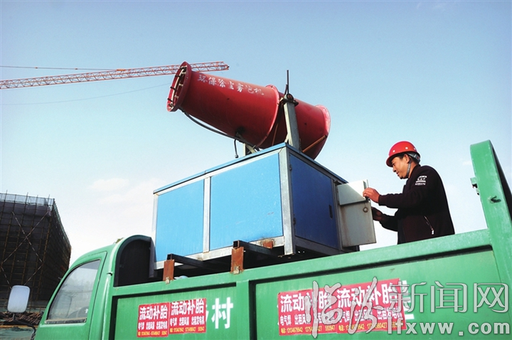 在霍州市全民健身中心建設工地,為有效抑制揚塵,施工方改裝設計了可移動的霧炮車。