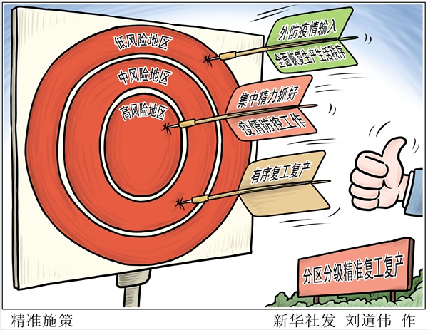 低風險地區要盡快將防控策略調整到外防輸入上來,全面恢復生產生活秩序,中風險地區要依據防控形勢有序復工復產,高風險地區要繼續集中精力抓好疫情防控工作。中央對下一步復工復產作出的部署,傳遞出精準施策的重要信號。