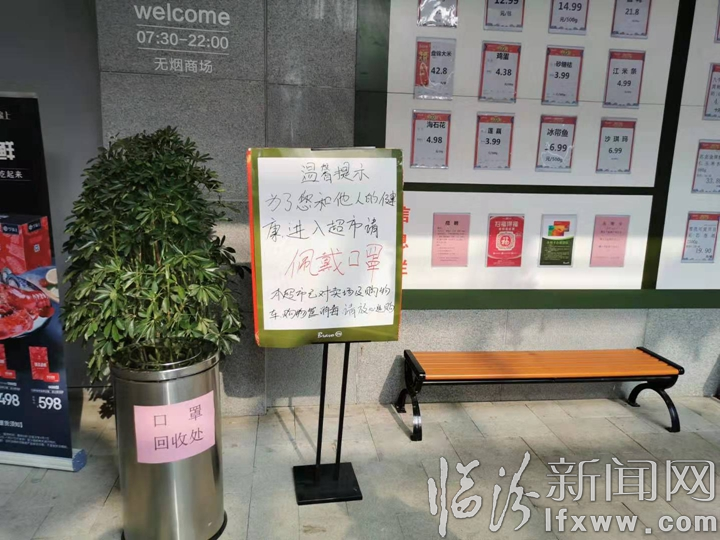 1月28日,在市區永輝超市臨汾悅匯廣場店,超市入口的“溫馨提示”格外醒目:“為了您和他人的健康,進入超市請戴口罩。本超市已對賣場及購物車、購物筐消毒,請放心選購。”在提示牌旁邊,放置著專門回收廢棄口罩的垃圾桶。