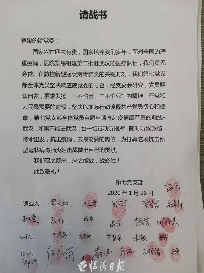 “全體黨員申請奔赴疫情最嚴重的前線,如果不能去武漢,隨時聽候調遣,去最需要的崗位,我們招之即來,來之能戰,戰必勝!”第七黨支部請戰書上26個鮮紅的手印躍然紙上,他們將分批去往武漢。