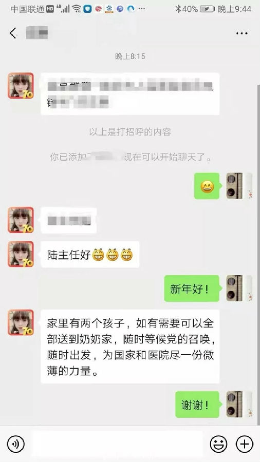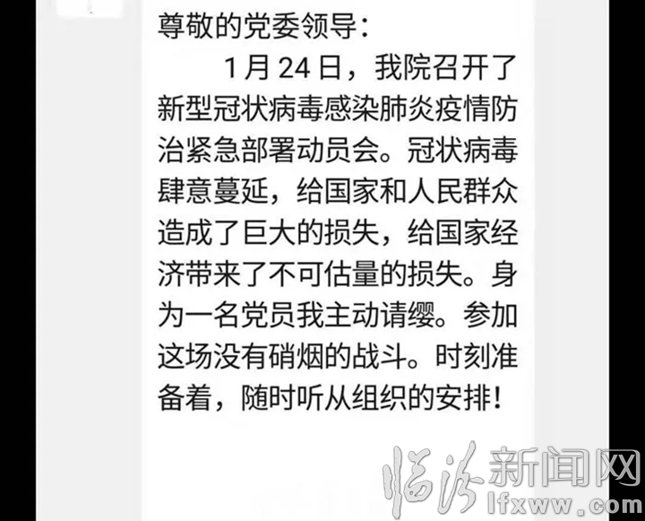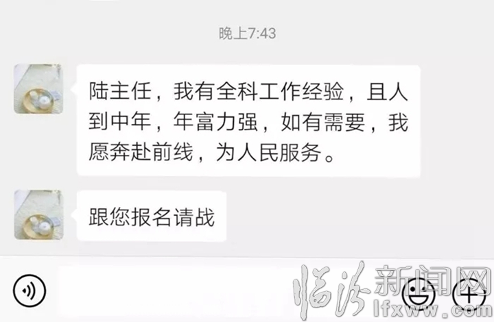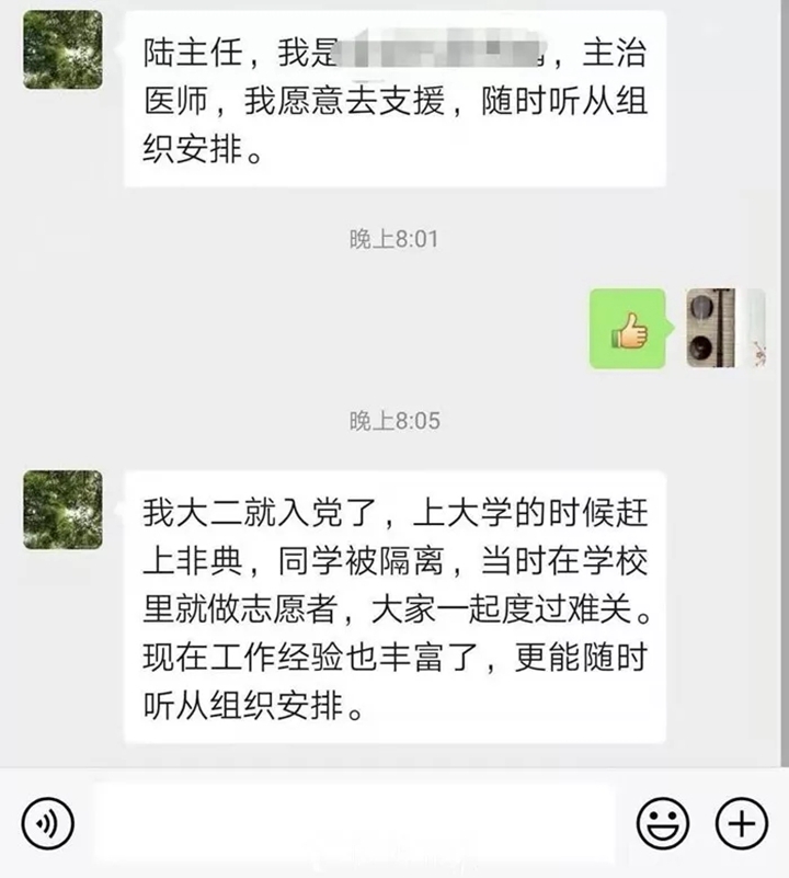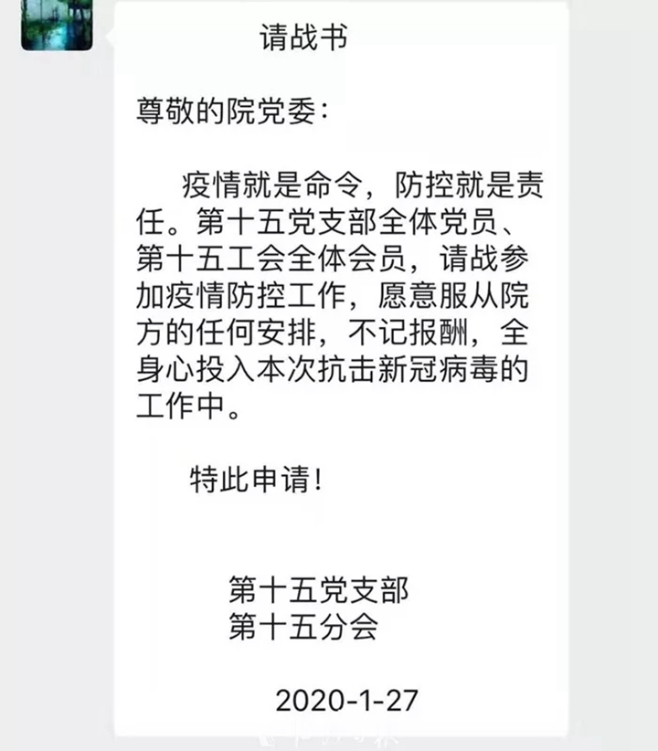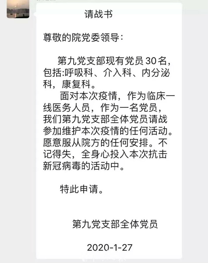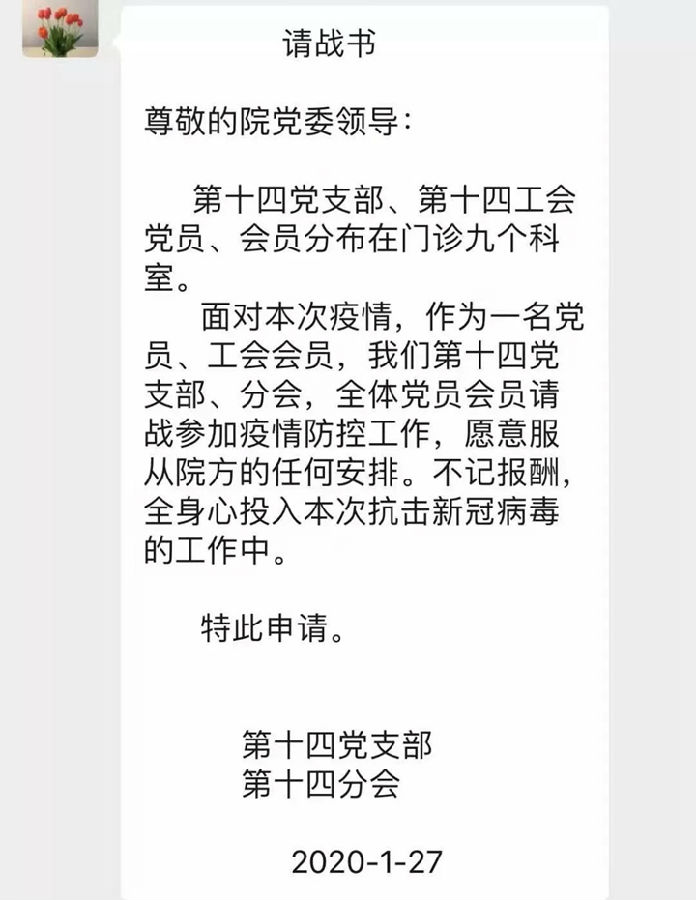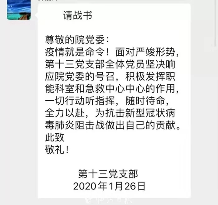 “家里有兩個孩子,可以全送到奶奶家,隨時等候黨的召喚,隨時出發,為國家和醫院盡一份微薄的力量。”該醫院黨員先鋒號的一名同志在微信上向院領導請戰!