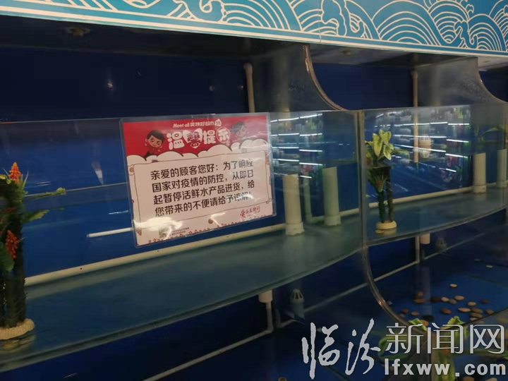 再往里走,活鮮水產品貨架已經全部清空,一張溫馨提示牌注明了:暫停活鮮水產品進貨。