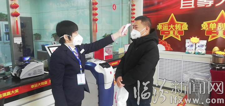 各分支行配備紅外線測溫儀、消毒液、一次性口罩等防疫用品,對進出網點人員進行體溫測量,加強全員崗前自測篩查工作。