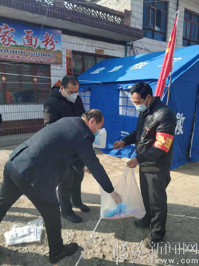 當天,臨汾市社區志愿者協會黨支部書記郭三旺和志愿者常宏斌一道,將口罩2000個、手套兩包、電子體溫計兩個、消毒液兩壺等捐贈物資,交到縣底鎮黃寺頭村委會負責人手中。