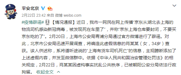 真相:北京市公安局發(fā)布通報稱,網(wǎng)民肖某某道聽途說“上海有貨車司機死亡”的消息,編造了“從湖北去上海的物流司機感染新型冠狀病毒死亡”的謠言,現(xiàn)已被依法行政拘留。