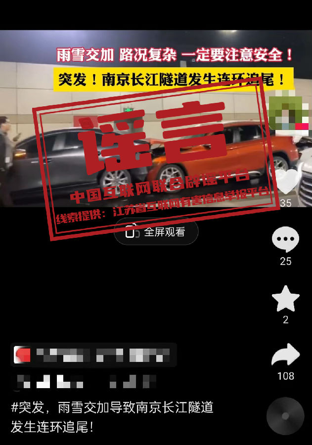 ??真相:12月18日,南京普降大雪,網上流傳一條關于“過江隧道多輛汽車連環追尾”的視頻,并以此提醒網民“下雪天注意路滑”“能不開車就不開車”,引發關注。經向公安部門核實,視頻中的事故發生在2021年4月1日南京江山大街隧道內。截至目前,南京市各隧道內暫未發生較大交通事故。