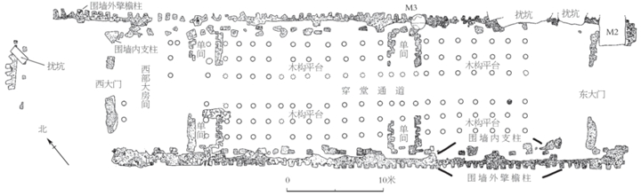 在青關(guān)山一號大型建筑基址中,考古工作者還發(fā)現(xiàn)穿堂通道、東西大門、單間、木構(gòu)平臺等遺跡。學(xué)者推測,這可能是國內(nèi)迄今發(fā)現(xiàn)的年代最早、規(guī)模最大的干欄式樓閣建筑,其研究性復(fù)原仍須進(jìn)一步檢驗(yàn)和論證。