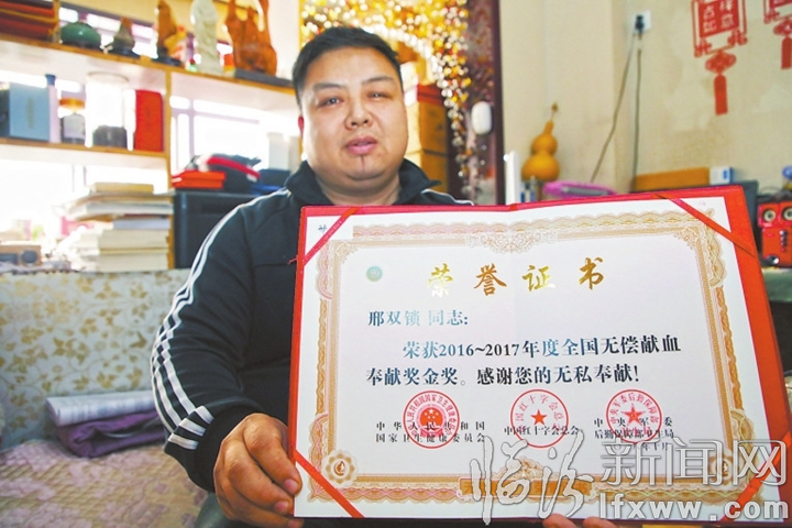 臨汾新聞網訊 他們是一滴滴水,匯聚成愛的海洋;他們是一棵棵樹,長成道德的森林;他們是一道道光,照亮你我前行……他們有個共同的名字——無償獻血志愿者。39歲的邢雙鎖就是他們中的一員,并先后兩次獲得全國無償獻血奉獻獎金獎。