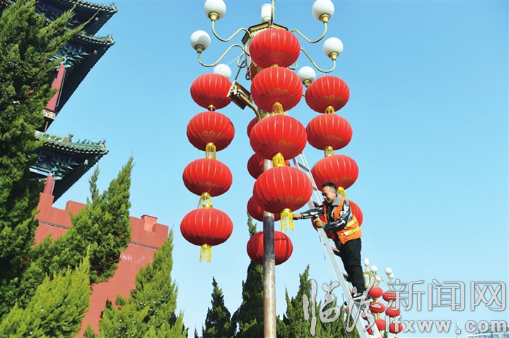 臨汾新聞網訊 1月19日,市城市照明維護中心的工作人員正在鼓樓附近懸掛紅燈籠,將市區裝點得紅紅火火。為了營造社會和諧、家庭幸福的喜慶祥和節日氛圍,我市大街小巷陸續懸掛大紅燈籠及滿天星、樹冠流星雨、變色投光燈等亮化燈具,喜迎新春佳節的到來。