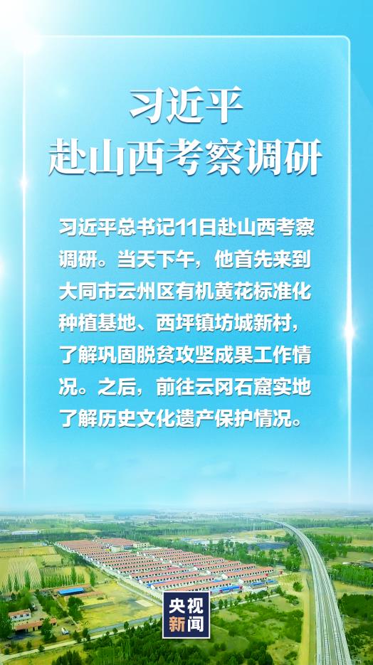 習近平總書記11日赴山西考察調研。當天下午,他首先來到大同市云州區有機黃花標準化種植基地、西坪鎮坊城新村,了解鞏固脫貧攻堅成果工作情況。之后,前往云岡石窟實地了解歷史文化遺產保護情況。