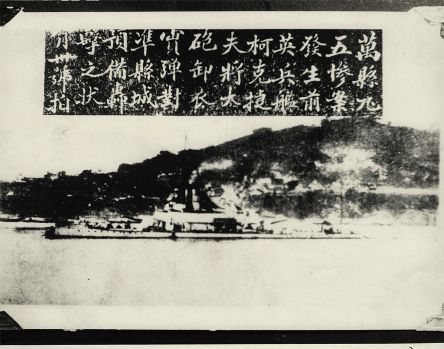 “九五”慘案發生前,英艦柯克捷夫號將大炮對準萬縣城(重慶市萬州區檔案館供圖)