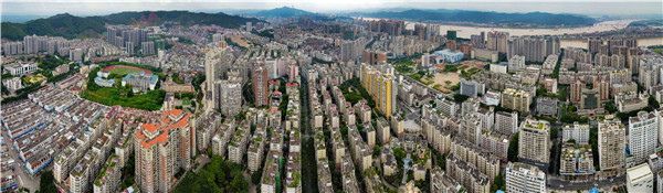 從空中俯瞰廣西梧州市新興三路沿線(xiàn)一帶,樓群林立,一派新興繁榮的都市景色。梧州日?qǐng)?bào)社記者 何鎏 攝