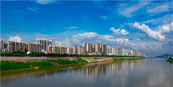 潯江沿岸高樓連綿,在藍(lán)天白云的襯托下,展現(xiàn)出一派宏偉現(xiàn)代都市氣息。梧州日?qǐng)?bào)社記者 何鎏 攝