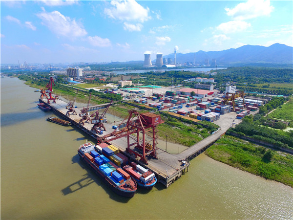 在安徽銅陵港長江外貿碼頭,港口機械在裝卸集裝箱物資。安徽銅陵是我國重要的銅工業基地,銅陵港是長江萬噸級輪船終點港。銅陵日報記者 詹俊 攝