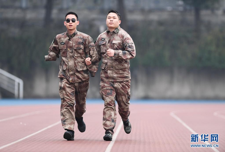 2020年1月2日,“排雷英雄戰士”杜富國(左)和戰友在陸軍軍醫大學操場上跑步。新華社記者 王全超 攝