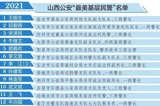 這次受表彰的民警,是全省廣大基層公安民警的優秀代表,是2021年在防風險、保安全、護穩定、促發展、戰疫情一線,特別是在慶祝建黨100周年安保維穩和“我為群眾辦實事”實踐活動中涌現出的基層民警先進典型。他們雖然崗位不同,但始終不忘初心、忠誠履職、敬業奉獻,用熱血忠誠、無悔奉獻書寫著新時代山西公安“最美”的警察人生。