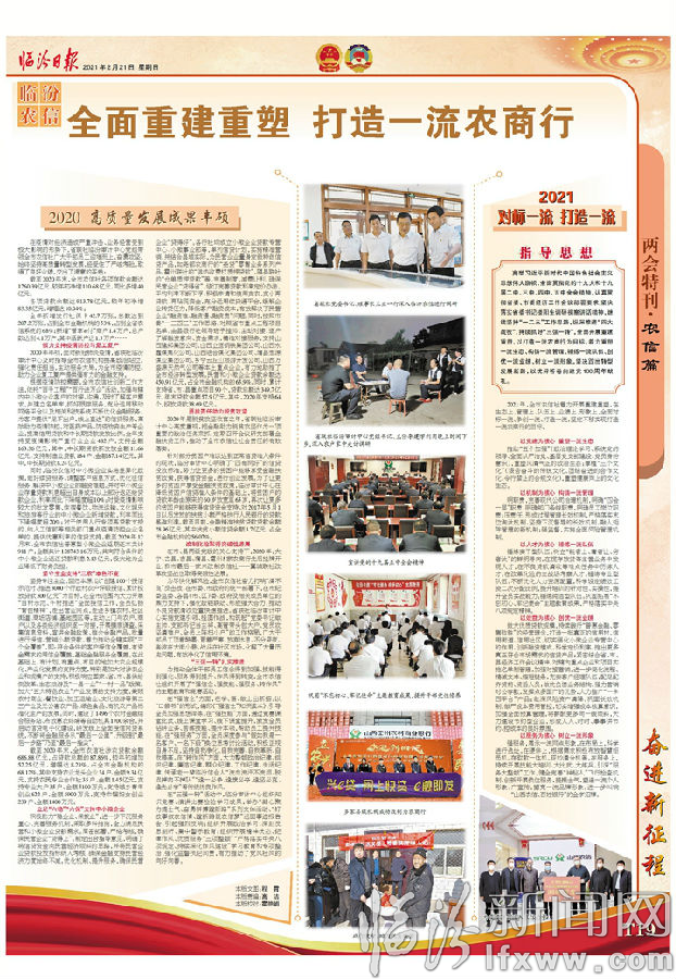 高舉習(xí)近平新時代中國特色社會主義思想偉大旗幟,全面貫徹黨的十九大和十九屆二中、三中、四中、五中全會精神,認(rèn)真貫徹省委、市委經(jīng)濟工作會議部署要求,堅決落實省委書記樓陽生調(diào)研視察講話精神,繼續(xù)堅持“一二三”工作思路,縱深推進“四大戰(zhàn)役”,持續(xù)抓好“三強一轉(zhuǎn)”,全面開展重建重塑,以打造一流農(nóng)商行為目標(biāo),著力重塑一流生態(tài)、構(gòu)鑄一流管理、錘煉一流隊伍、創(chuàng)優(yōu)一流業(yè)績、樹立一流形象,堅決蹚出轉(zhuǎn)型發(fā)展新路,以優(yōu)異答卷向建黨100周年獻禮。