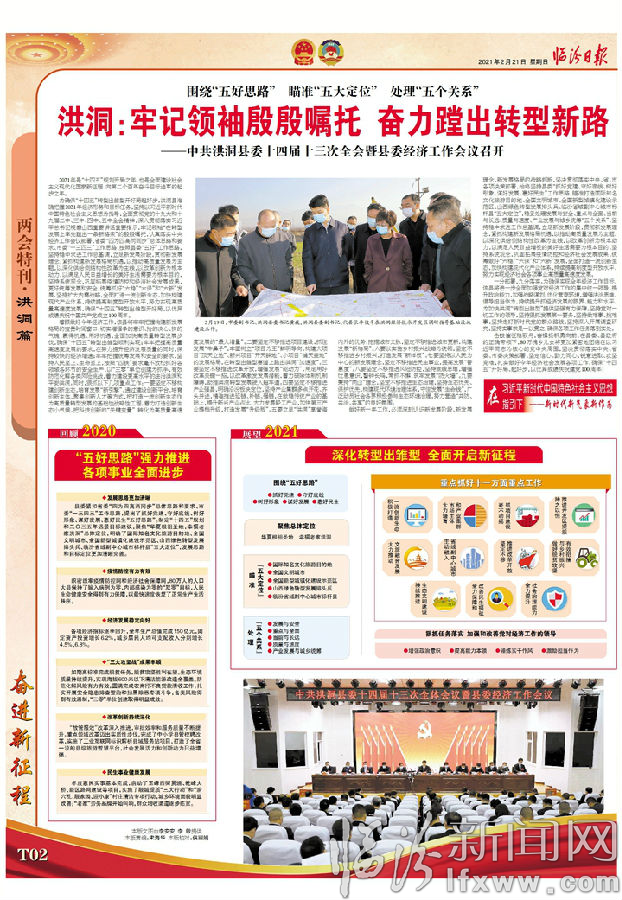 為確保“十四五”轉(zhuǎn)型出雛型開好局起好步,洪洞縣準(zhǔn)確把握2021年經(jīng)濟(jì)形勢(shì)和目標(biāo)任務(wù),堅(jiān)持以習(xí)近平新時(shí)代中國(guó)特色社會(huì)主義思想為指導(dǎo),全面貫徹黨的十九大和十九屆二中、三中、四中、五中全會(huì)精神,深入貫徹落實(shí)習(xí)近平總書記視察山西重要講話重要指示,牢記領(lǐng)袖“在轉(zhuǎn)型發(fā)展上率先蹚出一條新路來(lái)”的殷殷囑托,認(rèn)真落實(shí)中央經(jīng)濟(jì)工作會(huì)議部署、省委“四為四高兩同步”總體思路和要求、市委“一三四三”工作思路,按照縣委“五好”工作思路,堅(jiān)持穩(wěn)中求進(jìn)工作總基調(diào),立足新發(fā)展階段,貫徹新發(fā)展理念,緊抓構(gòu)建新發(fā)展格局機(jī)遇,以推動(dòng)高質(zhì)量發(fā)展為主題,以深化供給側(cè)結(jié)構(gòu)性改革為主線,以改革創(chuàng)新為根本動(dòng)力,以滿足人民日益增長(zhǎng)的美好生活需要為根本目的,堅(jiān)持系統(tǒng)觀念,鞏固拓展疫情防控和經(jīng)濟(jì)社會(huì)發(fā)展成果,更好統(tǒng)籌發(fā)展和安全,統(tǒng)籌抓好“六穩(wěn)”“六保”和“六新”發(fā)展,堅(jiān)持?jǐn)U大內(nèi)需戰(zhàn)略,全面打造一流創(chuàng)新生態(tài),加快構(gòu)建現(xiàn)代產(chǎn)業(yè)體系,持續(xù)提高制度型開放水平,努力實(shí)現(xiàn)高質(zhì)量高速度發(fā)展,確保“十四五”轉(zhuǎn)型出雛型開好局,以優(yōu)異成績(jī)慶祝中國(guó)共產(chǎn)黨成立100周年。