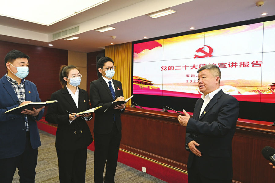 11月14日,省委宣講團成員、省委統戰部主持日常工作的副部長師帥在省委教育工委宣講二十大精神,并與師生代表進行深入交流。本報記者阮洋攝