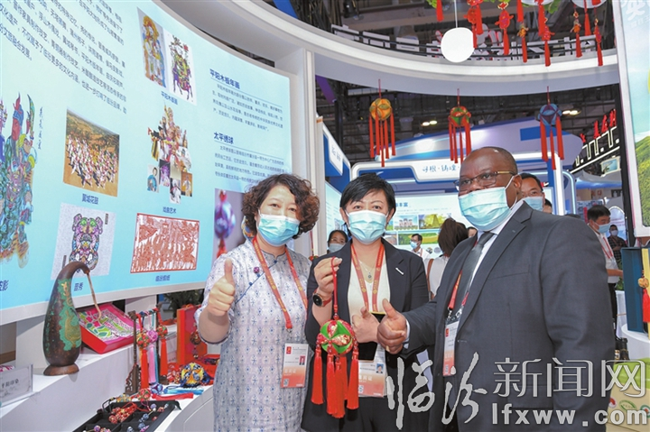 自“投洽會”開幕以來,投資熱點城市·臨汾展區,無處不在的“臨汾元素”吸引了眾多海內外嘉賓、客商前來參觀、交流和洽談。圖為貝寧駐華大使館的Luc Comlan EBAH來到展區,為臨汾非遺作品“太平繡球”點贊。 記者 閆銳鵬 攝