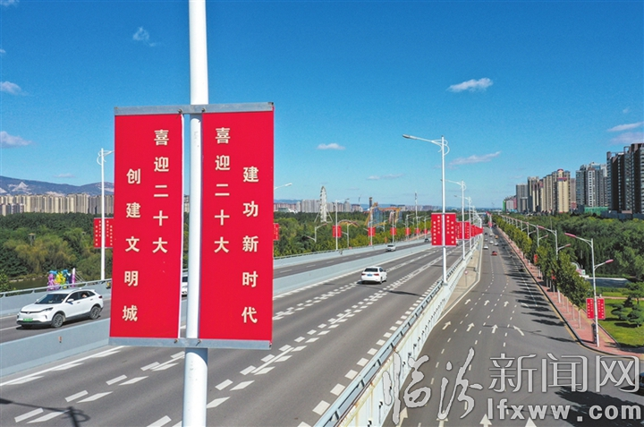 臨汾新聞網訊 連日來,全市各主干街道都精心布置了“喜迎二十大,建功新時代”的主題宣傳燈桿公益廣告,營造出濃濃的喜慶氛圍,迎接黨的二十大勝利召開。圖為市區濱河東路主題宣傳燈桿公益廣告。