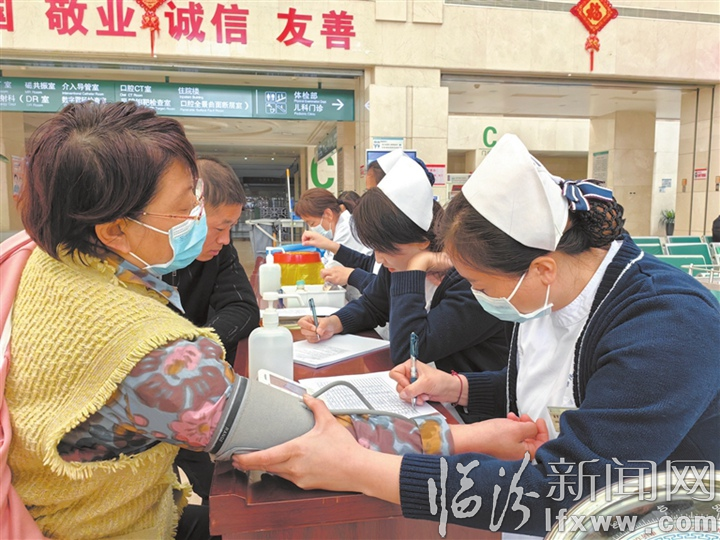 臨汾新聞網訊 2023年10月20日是第20個世界骨質疏松日。為了呼吁社會共同關注肌肉減少與骨質疏松的密切關系,更好地應對骨質疏松帶來的危害,市人民醫院于近日舉辦了一場義診活動,希望廣大居民做好自己健康骨骼的第一責任人。圖為該院醫護人員為患者測量血壓。