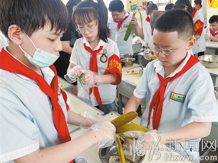 臨汾新聞網(wǎng)訊 端午期間,臨汾市逸夫育英小學(xué)開展了“遙思端午情 不負(fù)少年志”端午節(jié)主題活動(dòng),讓隊(duì)員們對(duì)端午節(jié)有了深刻的了解,激發(fā)了他們的民族自豪感和愛國(guó)熱情。圖為該校學(xué)生包粽子的熱鬧景象。