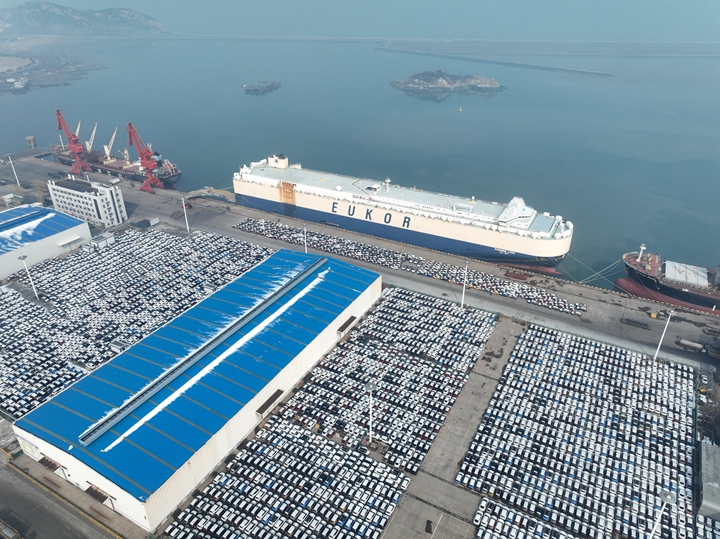 △在江蘇連云港港東方港務(wù)分公司碼頭,貨輪靠泊準(zhǔn)備裝載汽車(chē)出口海外。