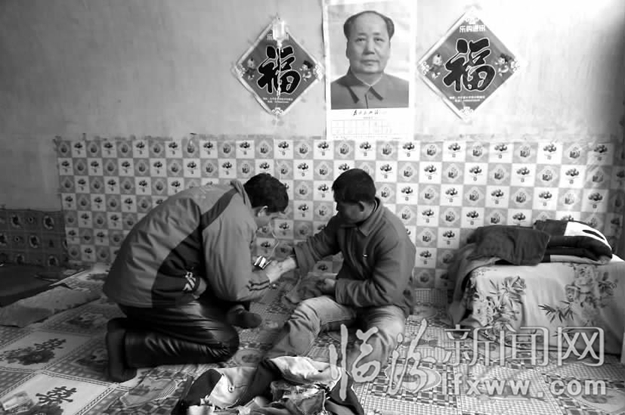 在下樂堂村,一位40多歲的癲癇者患者正在發燒,他的老母親顫顫巍巍地在旁邊伺候著。賀星龍一到,老母親滿是皺紋的臉上頓時露出了笑容。“哎呀,星龍來了,這下可放心了。”我們做了簡單的自我介紹,老奶奶拉著我們的手不放:“你們不知道,星龍這娃可好哩,看病不要我的錢,上回來還倒給我一百塊。”說著從被褥下面摸出一百元錢。賀星龍熟練地給病人掛好液體,憨厚地笑道:“快把錢收起來吧,有事隨時給我打電話。”說完,背起那個發白破舊的醫藥包又出發了。