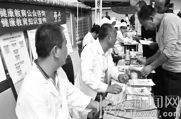 臨汾新聞網訊 大寧縣太古鄉衛生院醫護人員每月一次都要下到村里,對出不了門的老年人進行免費體檢,對建檔立卡貧困戶定期檢查。圖為該院在儀里村,利用該村舉辦蘋果展銷活動,擺攤設點為老百姓義診,發放健康教育宣傳資料。