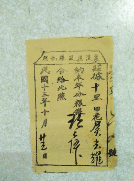 征糧執照為黃色紙張,紙張上方印有“襄陵縣征糧執照”7個字,右側有半邊字的征糧號碼,可以辨認的字有“第xx號”。正文中有“茲據‘十’里甲花戶‘吳光耀’,納本年分糧銀‘玖x伍x’,合給此照?!甭淇顣r間是“民國十三年十月廿三日”。