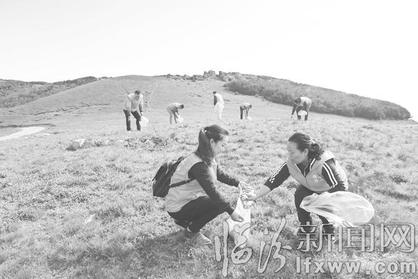 臨汾新聞網訊 5月24日,在歷山風景區,我市的旅游志愿者正在高山草甸上撿拾垃圾。