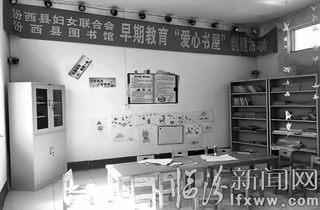 活動中心的桌子上放著“中心開展服務(wù)活動簽到表”,每位帶孩子來參加活動的家長都需要做詳細登記。活動中心后面擺放了兩個書架和一個鐵皮書柜、一些桌椅,兩個木質(zhì)書柜把活動區(qū)隔開,算是一間愛心書屋,存放著汾西圖書館為孩子們捐贈的繪本。墻壁上粘貼著“親子閱讀,播種幸福”的宣傳單。偶有微風(fēng)從窗戶吹進來,旁邊懸掛的幾串千紙鶴隨風(fēng)搖曳著。有陽光、有書、有懷抱幼兒的安詳,此般場景如畫般美好。