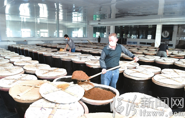 臨汾新聞網訊 日前,浮山縣振強農業開發有限公司有機醋生態示范基地的制醋工人正在用傳統工藝制醋。該公司是一家以加工雜糧醋為主導的農業企業,建設規模為年產1萬噸雜糧醋,公司投產后可安排剩余勞動力80余人,并帶動相關產業發展。