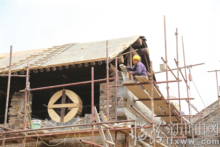 穿街過巷,溫金鋒隨即帶領記者拐進了一處帶有“福”字磚雕影壁的院落。影壁后面是兩個互為連通的四合院,屋廈下搭滿了密密麻麻的腳手架,來自山西惠生古建筑工程有限公司的工人們正在其間施工。
