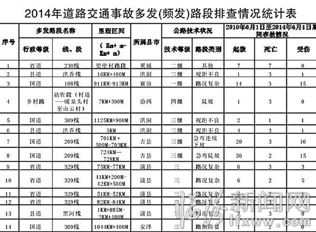 市公安局交通警察支隊按照省公安廳交通管理局《關于開展道路交通事故多發(頻發)路段排查工作的通知》文件要求,于2014年5月7日制定下發《全市公安交警開展道路交通事故多發(頻發)路段排查工作方案》,在全市范圍內開展道路交通事故多發(頻發)路段排查工作。截至目前,全市共發現和排查出符合相關標準的事故多發(頻發)路段14處,現將有關情況向社會予以公布(詳見附表)。