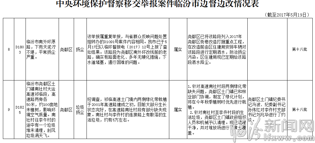 中央環境保護督察移交舉報案件臨汾市邊督邊改情況表