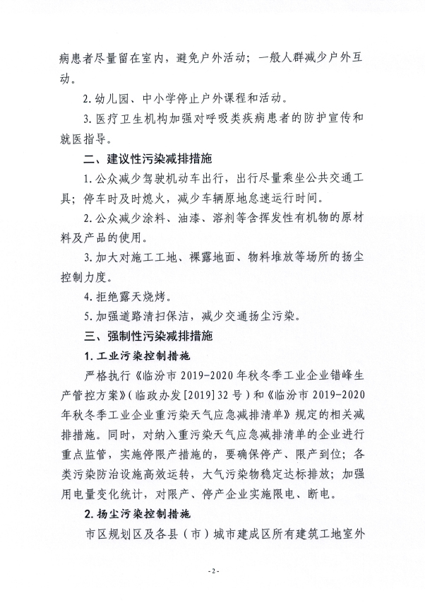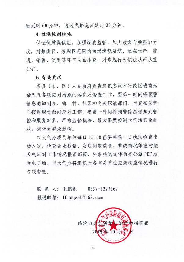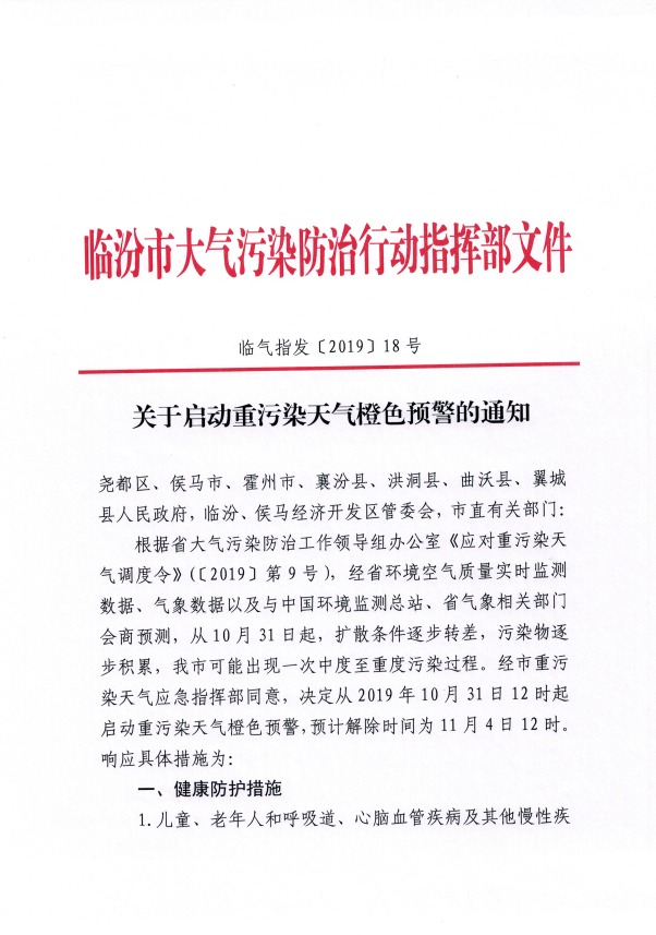 根據省大氣污染防治工作領導組辦公室《應對重污染天氣調度令》(〔2019〕第9號),從10月31日起,擴散條件逐步轉差,污染物逐步積累,我市可能出現一次中度至重度污染過程。經市重污染天氣應急指揮部批準,10月31日12時起,按規定啟動橙色預警應急響應。發布以下預防措施: