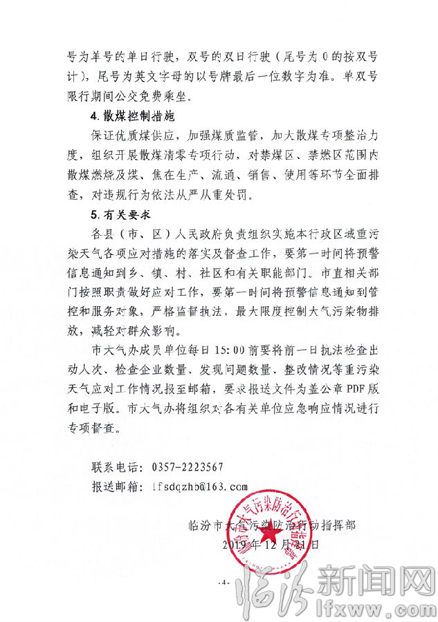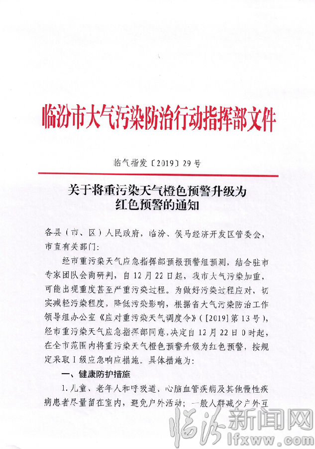經市重污染天氣應急指揮部預報預警組預測,結合駐市專家團隊會商研判,自12月22日起,我市大氣污染加重,可能出現重度甚至嚴重污染過程。為做好污染過程應對,切實減輕污染程度,降低污染影響,根據省大氣污染防治工作領導組辦公室《應對重污染天氣調度令》([2019]第13號),經市重污染天氣應急指揮部同意,決定自12月22日0時起,在全市范圍內將重污染天氣橙色預警升級為紅色預警,按規定采取Ⅰ級應急響應措施。具體措施為: