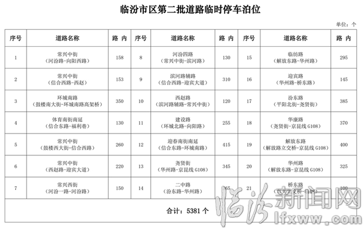 為緩解城區(qū)停車難問(wèn)題,方便群眾路內(nèi)臨時(shí)性停車,根據(jù)公安部《城市道路路內(nèi)停車泊位設(shè)置規(guī)范》、《臨汾市機(jī)動(dòng)車停車場(chǎng)管理辦法(試行)》等法規(guī)規(guī)定,確定第二批道路臨時(shí)停車泊位共5381個(gè)。