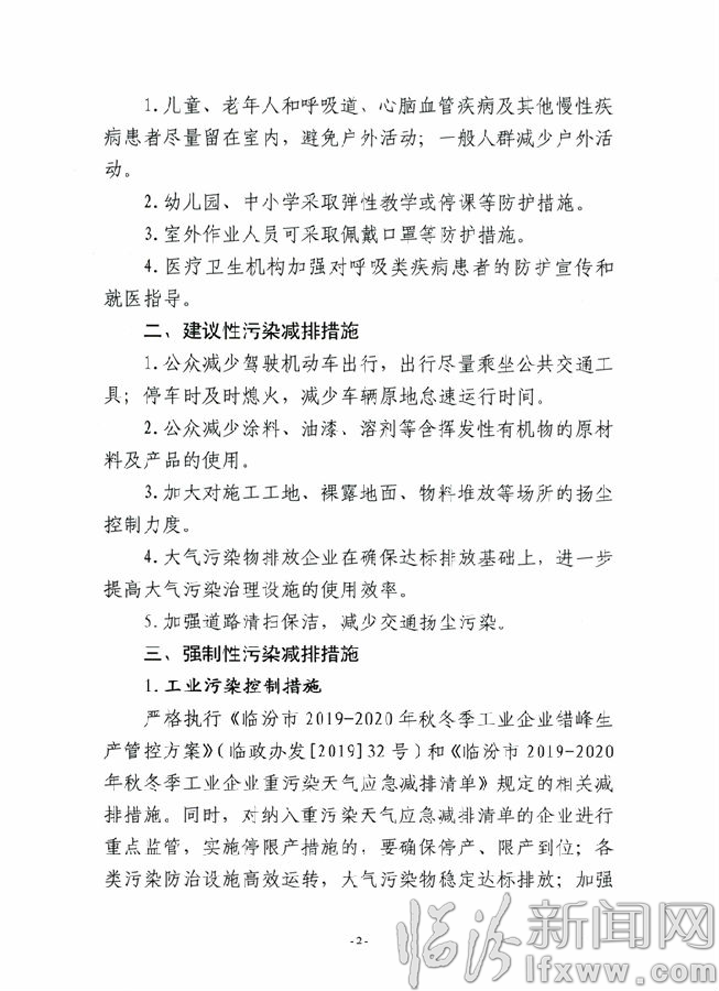 嚴(yán)格執(zhí)行《臨汾市2019-2020年秋冬季工業(yè)企業(yè)錯峰生產(chǎn)管控方案》(臨政辦發(fā)[2019]32號)和《臨汾市2019-2020年秋冬季工業(yè)企業(yè)重污染天氣應(yīng)急減排清單》規(guī)定的相關(guān)減排措施。同時,對納入重污染天氣應(yīng)急減排清單的企業(yè)進行重點監(jiān)管,實施停限產(chǎn)措施的,要確保停產(chǎn)、限產(chǎn)到位;各類污染防治設(shè)施高效運轉(zhuǎn),大氣污染物穩(wěn)定達標(biāo)排放;加強用電量變化統(tǒng)計,對限產(chǎn)、停產(chǎn)企業(yè)實施限電、斷電。